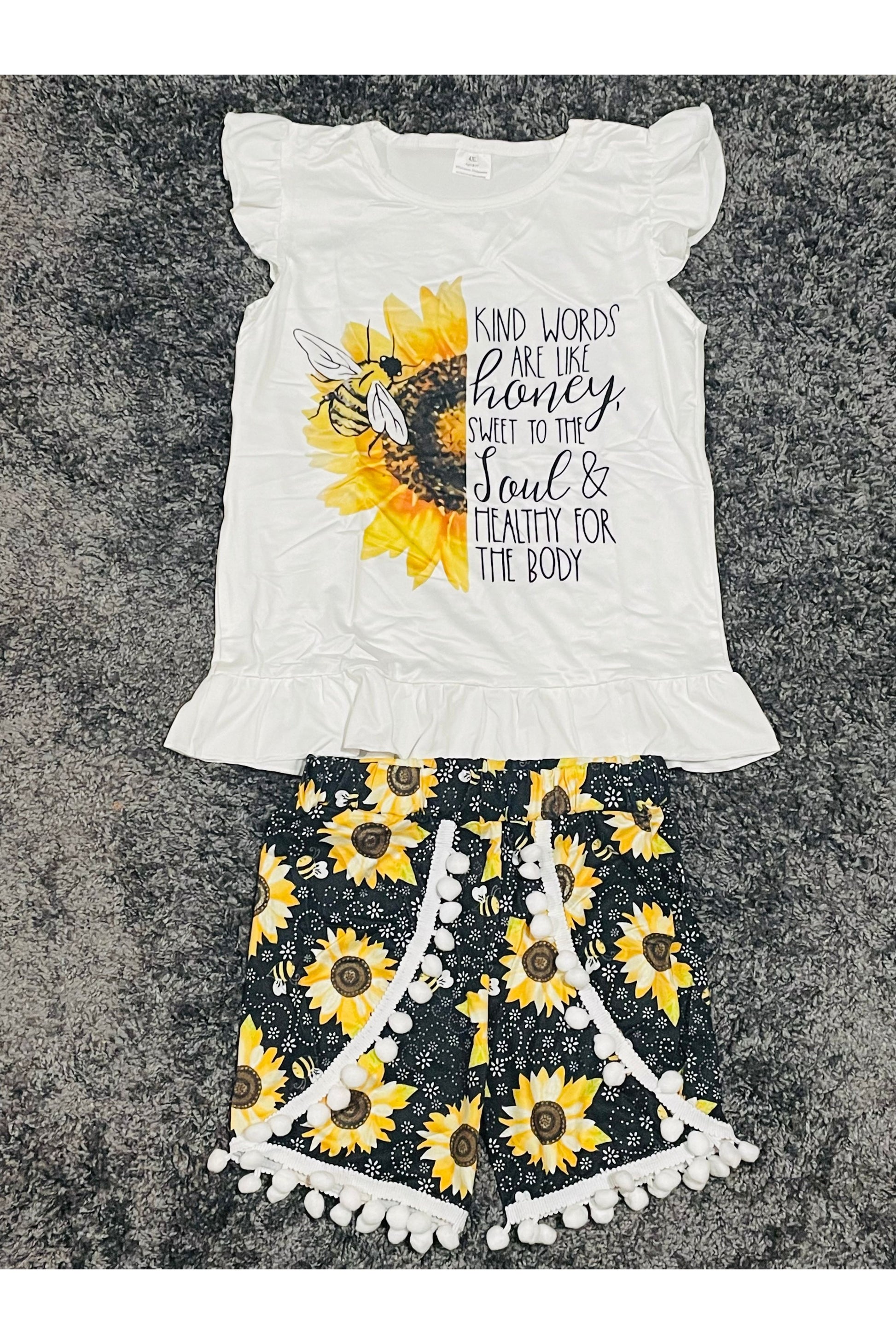 Sweet and Stylish! Our adorable "Kind words are like honey" Little Girls Sunflower Boutique Set from JLadyBoutique would make any child's day brighter! This outfit is all about positivity and fashion coming together. The beautiful sunflower prints will definitely bring your little one closer to nature, while the inspirational quote "Kind words are like honey" subtly instills a valuable lesson each time she wears it. Love, warmth, and cheerfulness – all packed in one boutique set! Perfect for summer outings with the family.