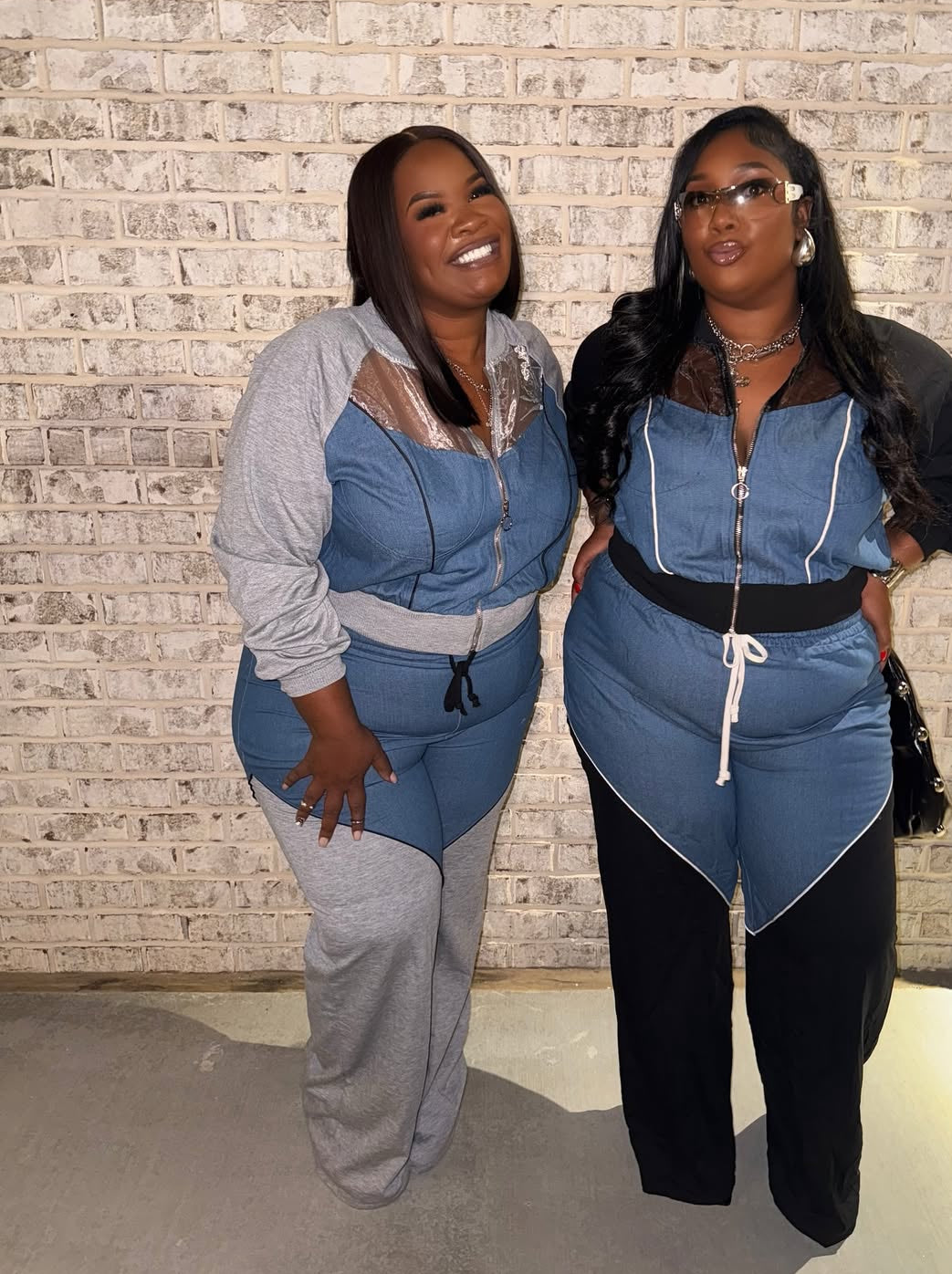 Cute, comfy and stylish! This denim contrast set features a zip-up jacket with sheer trim and matching wide-leg drawstring pants. Soft stretch fabric gives the perfect relaxed fit